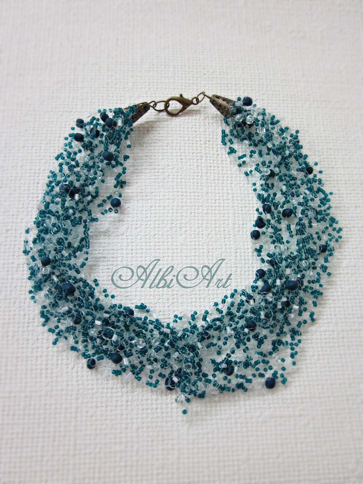 Collar corto de cristal toho verde azulado, rocalla transparente y cuentas de arcilla polimérica